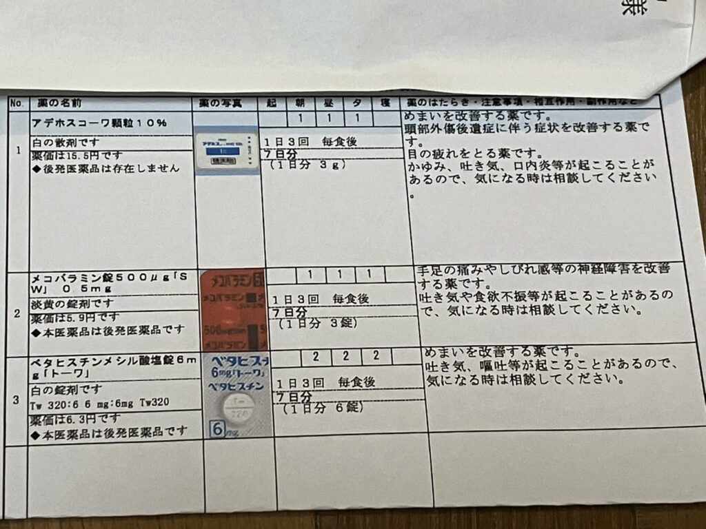 耳鼻咽喉科でもらえる薬は①良性発作性頭位めまい症自体を治すというよりは治るまでのめまい症状を抑える感じです。